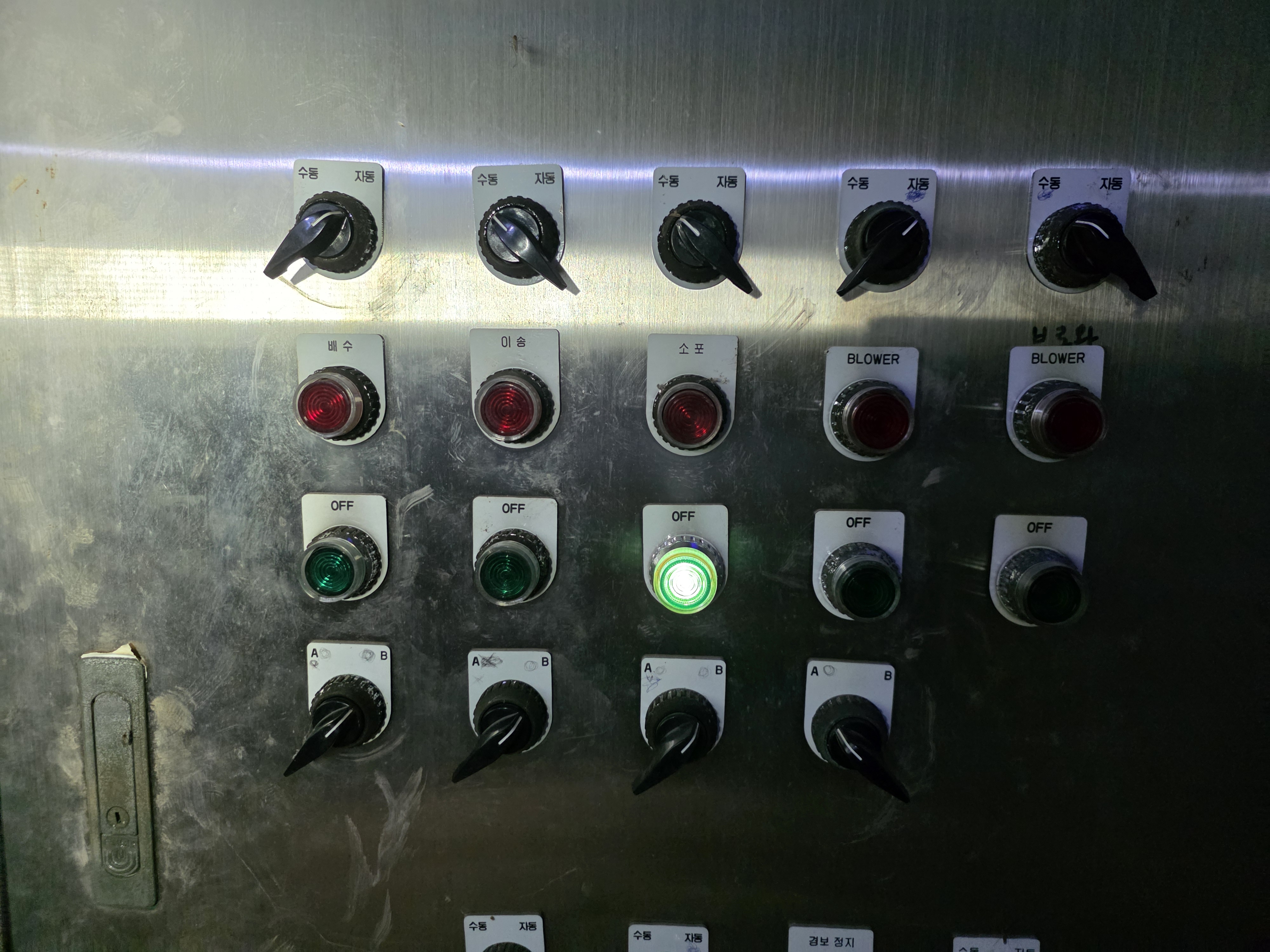 먼저 담당자에게 판넬에 조작 버턴을 확인받고 MCCB차단과 함께 셀렉터스위치를 수동으로 위치시킴니다